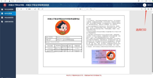 找到 “单招准考证打印飘窗” 或 “右上方打印准考证” 进入单招录取系统。