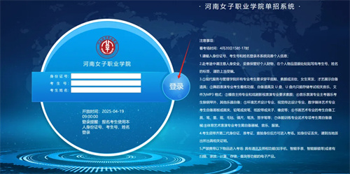 进入单招系统后,输入身份证号、考生号、考生姓名登录系统(系统开放时间:2025年4月19日9:00)。